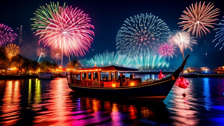 traditional Dhow boat sailing at night with colorful fireworks in the sky