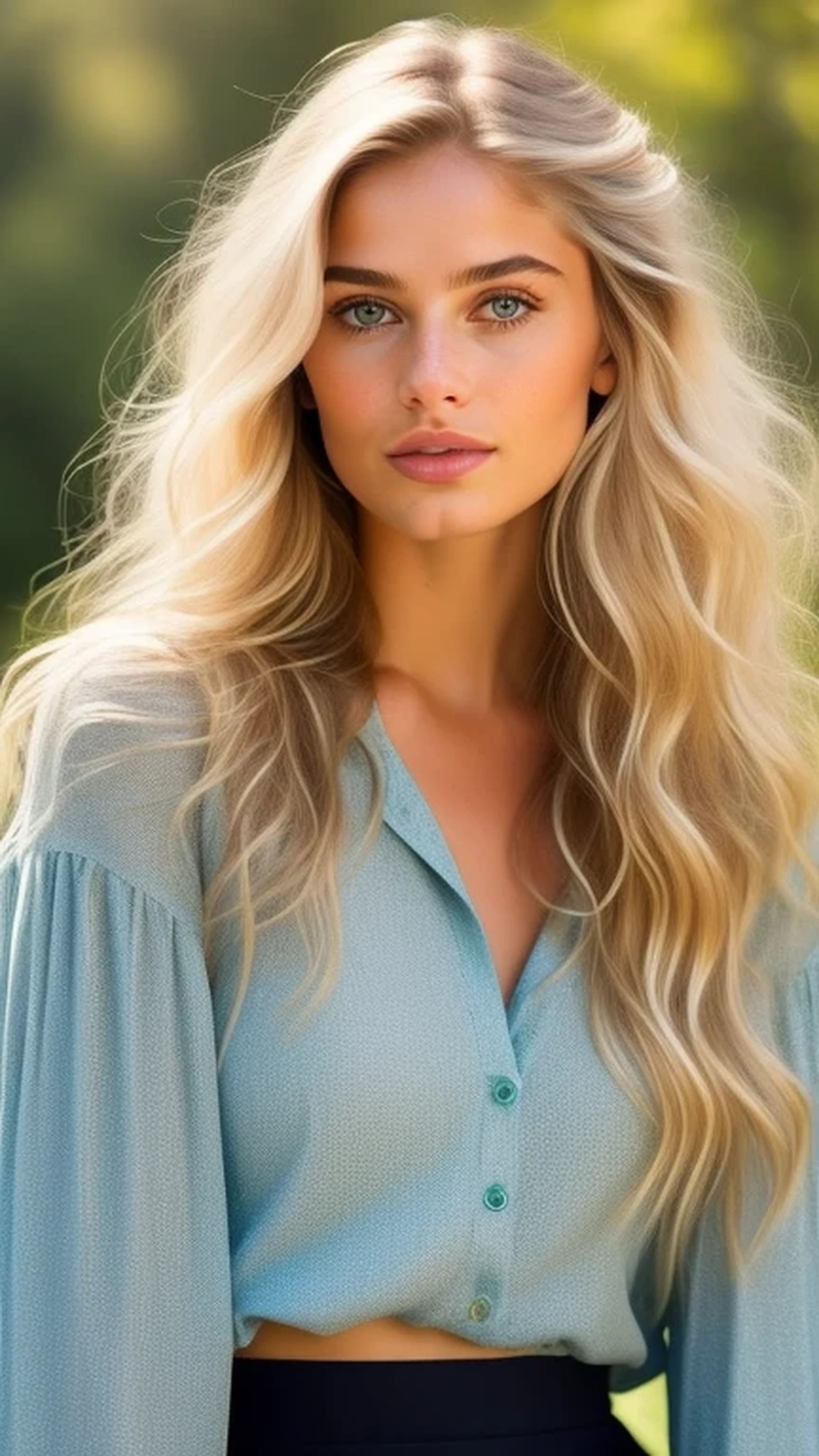 from the (early 1990s). She is wearing glossy dark red lipstick with a slight metalic sheen, and her eyeshadow is a metallic light blue. Her (platinum blonde) shoulder-length hair matches the (bouffant style) shown in this video clip of her (https://www.youtube.com/watch?v=hdD2cldVlqE). She is wearing an emerald green silk blouse with a dark green paisley pattern barely visible, and a wide brown leather belt. Individual hairs on her head should be visible and sharply in-focus, with as much detail as a high-resolution photograph. The CNBC studio should be visible in the background. The picture is detailed enough to see the fine lines on her forehead, and at the corners of her eyes, as well as the pores in her skin. Each (eyelash is clearly defined), and it possible to see differential thickening of the lashes from the dark mascara she uses. Her eyes are ((brown, with a slight amber hue at the edge of the pupil)). Her cheeks are full, looking like a 20-year-old's cheeks, even though the fine lines near her eyes suggest she is in her mid- to late-thirties. Her earrings are round, and made of dark hammered brass, resembling small gongs. The roots of the hairs on her scalp look brunette for the first few millimeters, making it clear that her platinum blonde locks are dyed. She has more pronounced lines under her eyes, with just a tiny bit of puffiness, giving her eyes a look similar to model Taylor Hill, although her nose and the shape of her lips are more similar to model Marina Laswick. She has a slight, bemused smile, revealing that her two front teeth have a bit of an overbite.