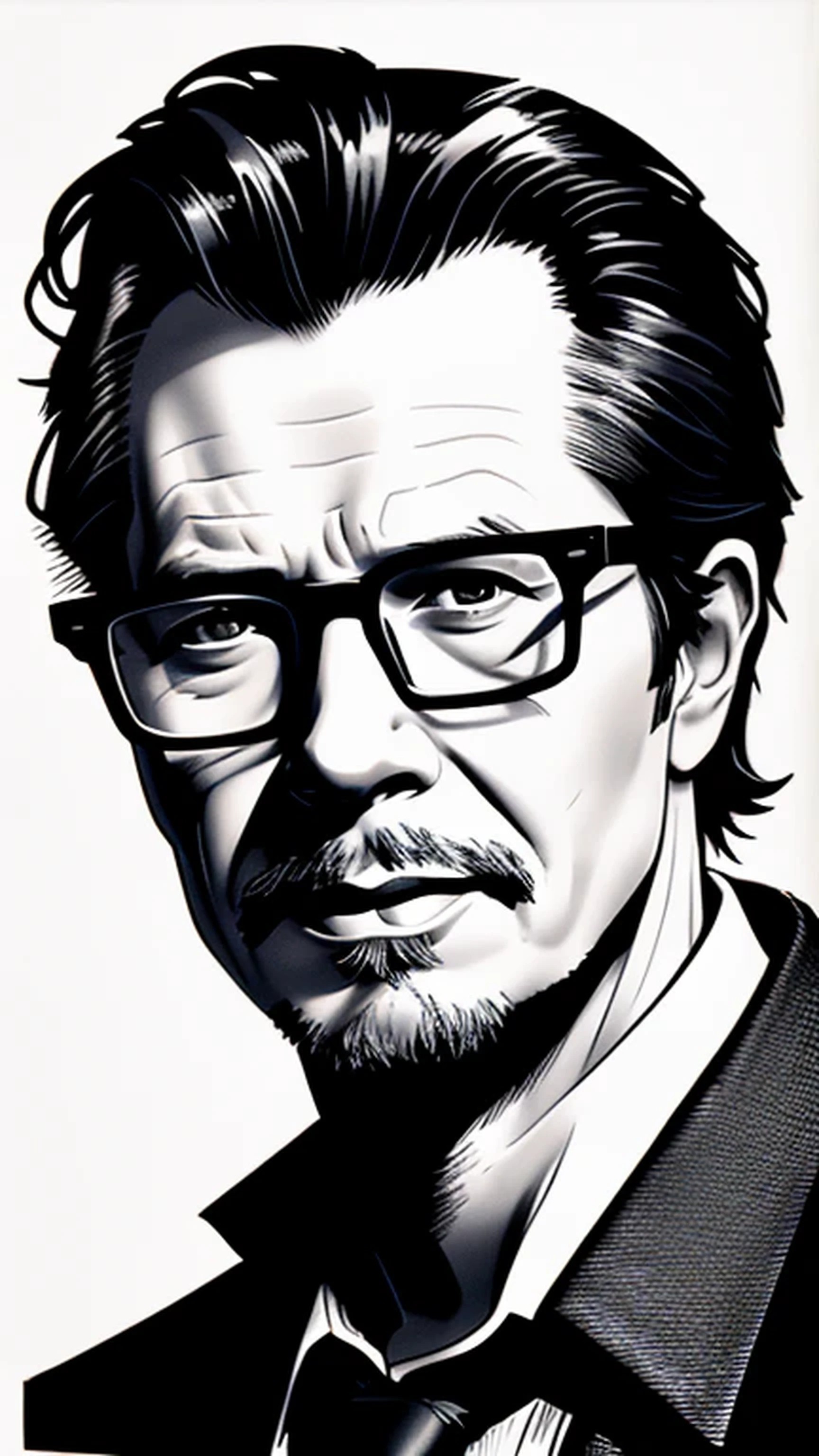 Ink sketch Gary Oldman with glasses close-up portrait, Figurative, Ink, Rough, Midnight black, Underlit, Sean Murphy