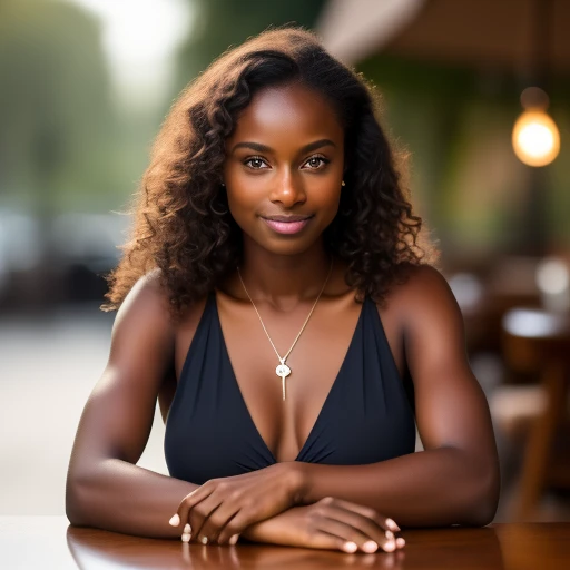 A very dark skinned woman with a lovely smile seated at a cafe table, ((photo-realistic)), ((uhd)), ((down blouse cleavage view)), ((action poses)), (((zoomed in : 1.20))), ((highest resolution)), ((highest quality)), ((highest detail)), ((sharp focus)), (Perfect Face - [ Eyebrow, Eye, Eyelid, Nose, Mouth, Lip, Teeth, Scalp, Throat, Hair ] )), ((Perfect Limbs - [ Shoulder, Chest, Arm, Elbow, Forearm, Wrist, Hand, Finger, Fingernail, Thumb ] )), ((Perfect Limbs - [ Leg, Thigh, Knee, Calf, Foot, Ankle, Toe, Toenail, Buttocks, Hip, ] )), ((detailed jewelry)), ((black as really dark chocolate skin tone)),