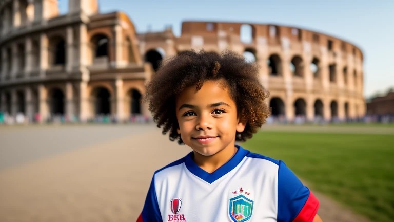 a two years mulatto little boy with the Italian football team shirt and a three years mulatto girl, in front of the colosseum in the background