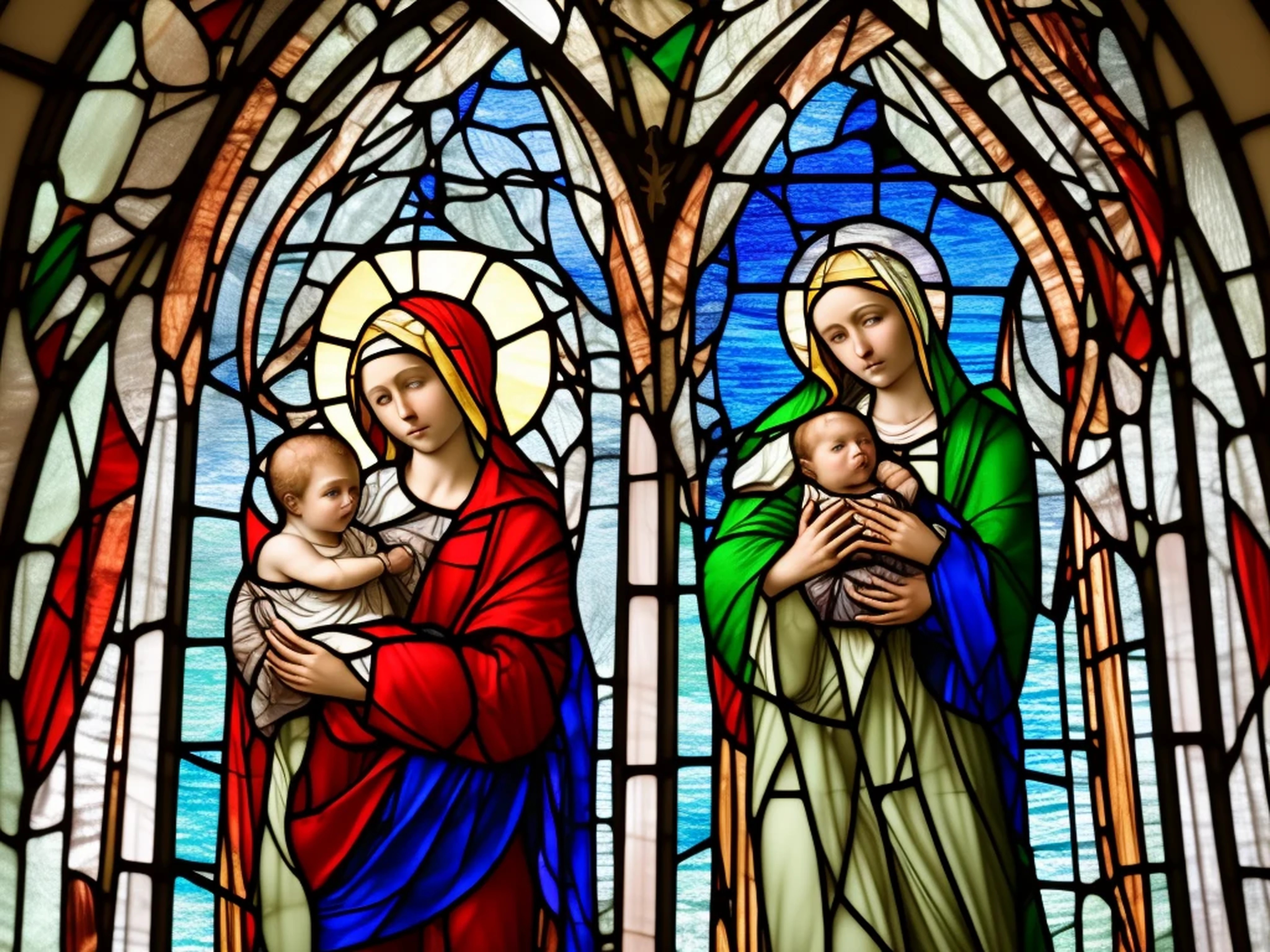 stained glass window, baby Jesus and Holy Mother