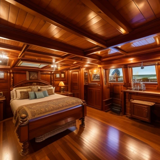 Royal Navy Captains Cabin onboard (16th century) Man O'War Ship (Interior view) ((detailed timber)), ((detailed sails)), ((detailed decks)), ((detailed bow)), ((detailed stern)), ((detailed ocean)), ((detailed cannon)), ((detailed background)), highest resolution, highest quality, 64k, sharp focus, 3d,