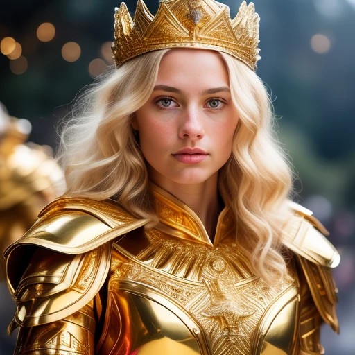 Knights of the Zodiac - Queen (Gold Armor) (Gold Crown Helmet) ((detailed face)), ((detailed body)), ((detailed Hair)), ((detailed background)), highest resolution, highest quality, 64k, sharp focus,
