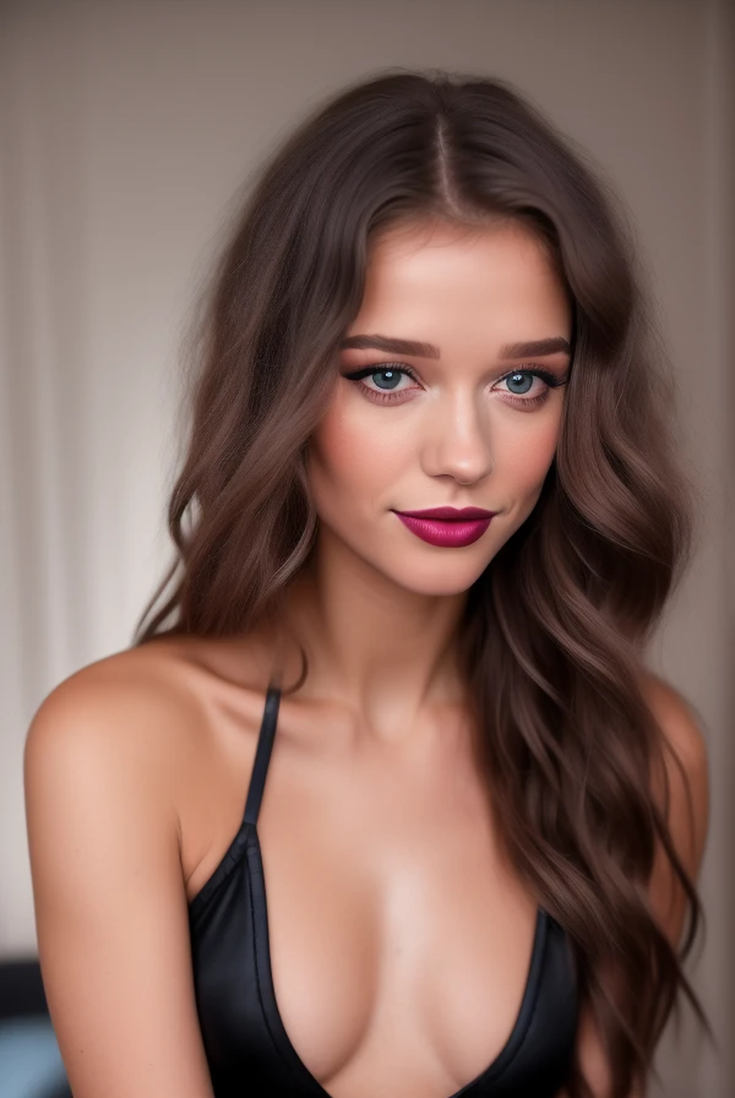 ((((8K UHD superbly-detailed and exceptionally-sharp natural sunset light glamour shot)))), showing off (((((every tiny and subtle detail of her perfect eyes and sultry eye makeup))))). (((85mm f/9, tight framing with macro-lens skin texture detail and close-up high-resolution eyes))), including (((wavy radial stroma in her irises))). A (beautiful Caucasian woman) with ((((thin, natural lips and normal body proportions)))) ((smiling as she gazes at the full-length mirror in her bedroom)). ((She is wearing professionally-applied makeup, including foundation; dark bronze blush on her cheekbones; and heavy application of dark blue eye shadow, black eyeliner, and mascara. Her skin looks smooth and flawless)). She is dressed in (((a black silk camisole dress, cinched with a 2"-wide gray leather belt))). ((She is lean and athletic, with moderate curves)). She has beautiful ((((shiny and lustrous raven-black hair, with black cherry undertones)))), (((worn shoulder-length, center-parted, and styled so the long bangs curl outward))). (((Her eyes are unusually large, round, and pale blue-gray, dominating her face))) -- eyes with (perfect round irises), (round, dark pupils), and (long, thick lashes). ((Her skin has a dark summer tan, and her foundation is keyed to that darker color, giving her flawless skin a swarthy, Mediterranean tone)). She is in her early to mid-20s. Facially, she's a mix of (Léa Seydoux 1.8), (Zooey Deschanel 1.8), (Brittany Murphy 1.9), (Ellesse Cheale 1.8), (Lydia Bielen 1.8) and (Natalia Dyer 1.9), with (the nose of Olivia Newton-John 1.9) and ((the mouth and teeth of Noelle Brown)). (Lips are relatively thin and natural). She also has ((((significant puffiness under her eyes, like she is severely sleep-deprived)))), plus ((full, but natural lips)) and ((a slight overbite that exposes the bottom half of her upper front teeth a bit more 1.5)). She has long, fine eyelashes, and is (((wearing dark fuchsia lipstick with a sleek glossy sheen))).