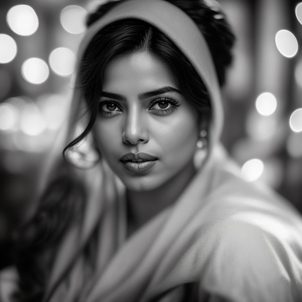 dreamy portrait of Priyanka Chopra with monocle, closeup, in style of lithography from 1905, monochromatic