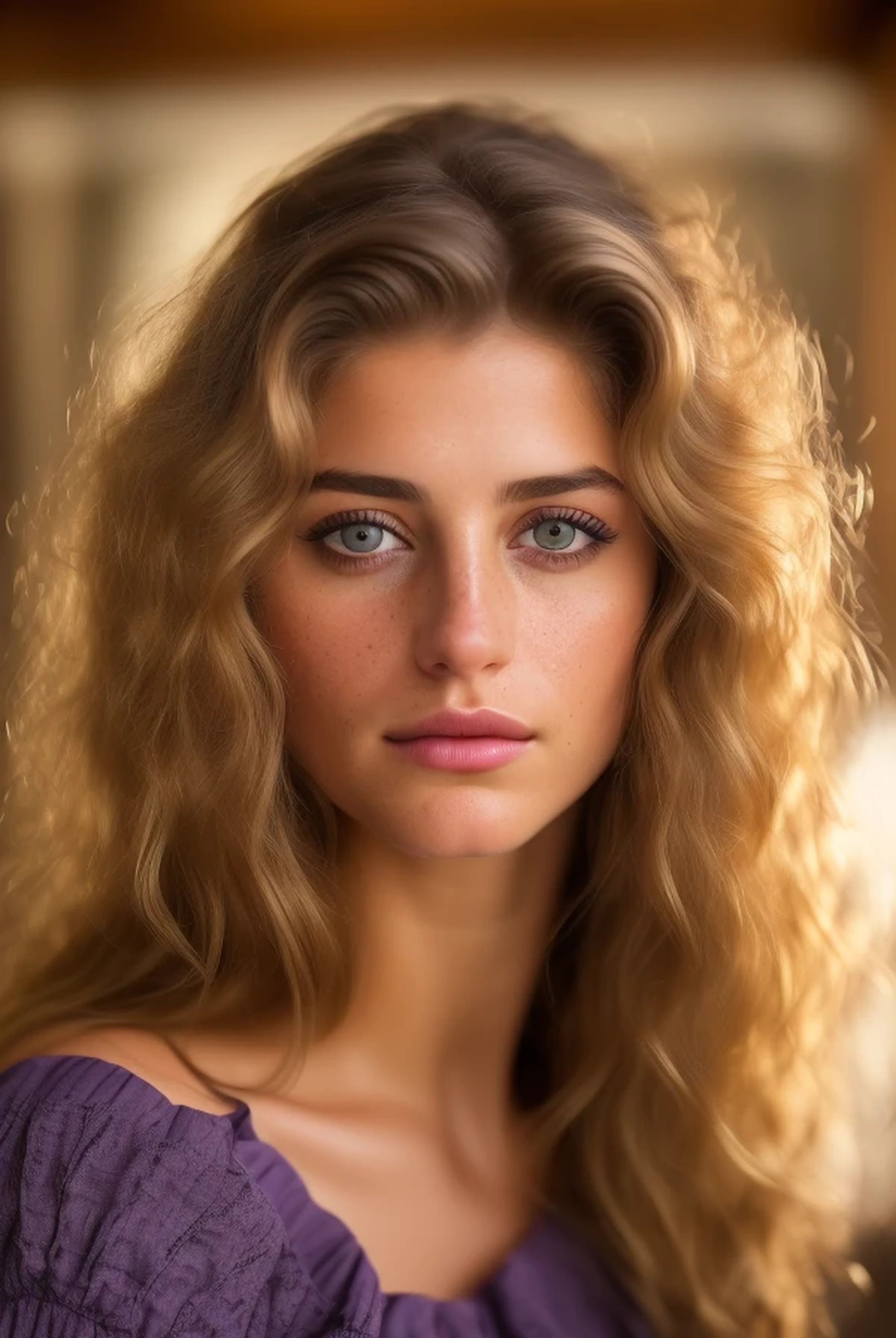 (((Ultra high-resolution, very sharp and in-focus, Associated Press close-up))) of a young ((light-skinned Caucasian)) woman standing in a bar. (((The picture shows her face in extremely fine detail: every hair, texture, fine line and subtle make-up detail in sharp focus, like a frame of IMAX film))). She has (((very straight, shoulder-length medium brown hair))) with ((Nordic blonde highlights)) -- (((hair without any wave or curl, hanging straight and limp from the crown of her head to the top of her shoulders))). The woman is in her mid-20s and dressed in a (((dark blue-green blouse))). ((She is slender, but with natural C-cup breasts))). Facially, she resembles a cross between (Melanie Laurent 1.7), (Jadiann Thompson 1.5), (Elizabeth Turner 1.4), (Ellana Bryan 1.4) and (Natalia Dyer 1.3), with (the eyes and nose of Olivia Newton-John circa 1975 1.9), and (the mouth and teeth of model Noelle Brown 1.8), though (((her skin is far from flawless: a couple of moles on her left cheek and some mild acne.))) She also has (((visible puffiness under her eyes, like someone who hasn't slept in a few days, and deep creases marking the lower edge of the puffiness))), plus ((full, but natural lips)), and ((a moderate sprinkling of very light, but quite visible freckles across her cheeks, nose, forehead and chin, with the concentration strongest on her nose 1.7)),((Her lips are parted, mouth slightly agape, revealing a strong overbite and prominent top front incisors aligned just in front of the others, similar to buck teeth)). She has long, fine eyelashes, and the eyebrows are detailed enough to make out individual hairs. (((Her lips show fine vertical lines, beneath a layer of shiny burgundy lipstick, and her upper lip is somewhat raised and tented in the middle))). (((The only make-up she is wearing is an intense line of dark eyeliner, enough mascara to really thicken her lashes, and a heavy application of smokey purple eye shadow. Otherwise, her face is make-up free.)))