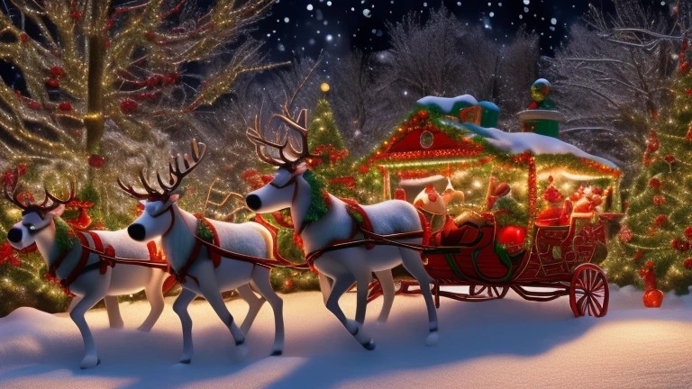 Draw a Disney style cartoon of Rudolph the Red-Nosed Reindeer, depicting in (full profile facing left) featuring large, branched antlers and using ((his luminous red nose)) to lead the (reindeer team) and guide ((Santa's sleigh)) on Christmas Eve. in 3d, ((realistic)), ((action poses)), ((detailed background)), ((detailed bodies)), ((detailed faces)), ((detailed hands)), ((highest resolution)), ((highest quality)), ((clothed))