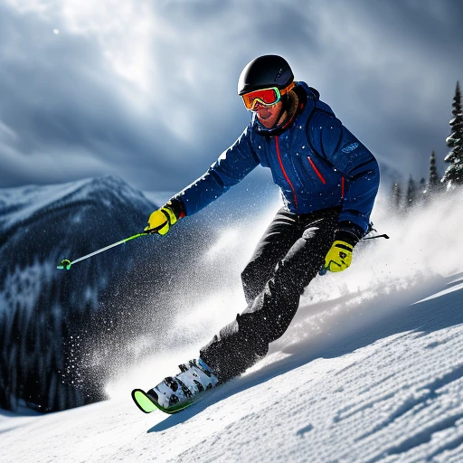 A person downhill-skiiing below a cloudy and snowy background ((3d)), ((realistic)), ((action poses)), ((detailed background)), ((detailed bodies)), ((detailed faces)), ((detailed hands)), ((highest resolution)), ((highest quality)), ((clothed))