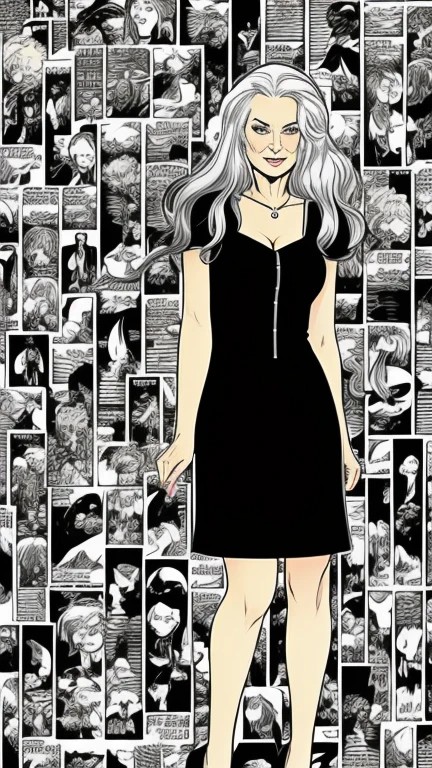 75 year old in a black short dress, black high heel pumps, long grey hair