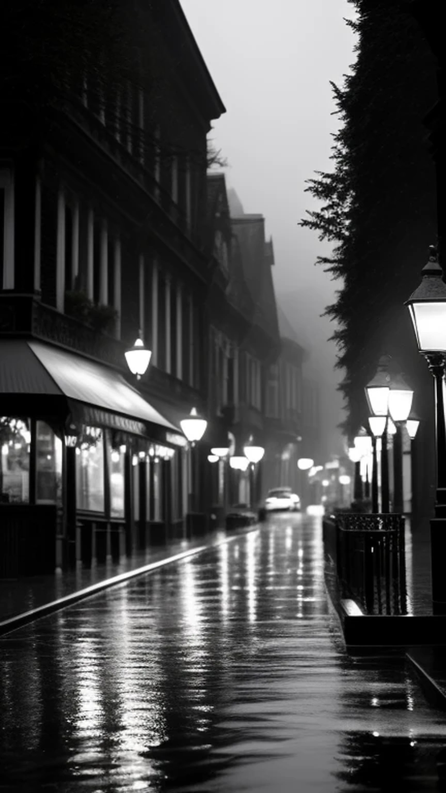 Art Nouveau streets in Brussels in hard rain, dark night, black ink brush on white paper, Milton Caniff, high contrast