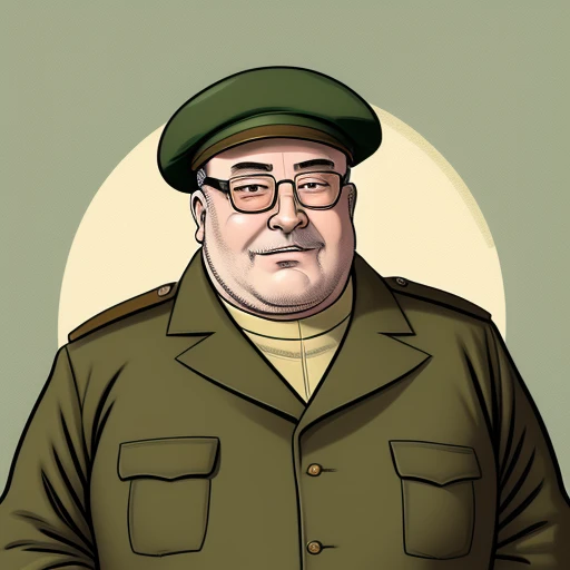 man in his late 50s with beret, glasses, no beard or moustache, quite fat, in his military jacket