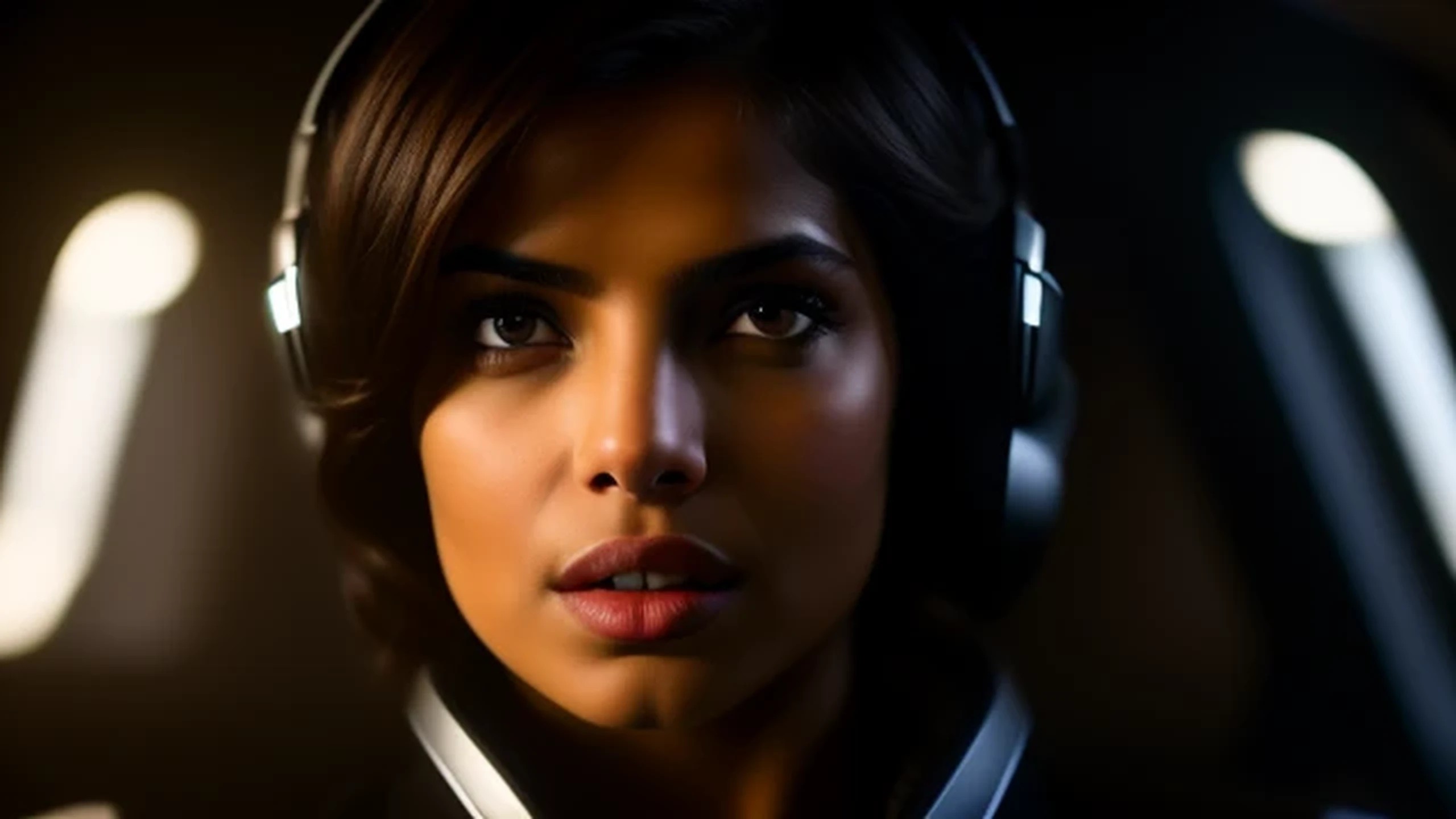 Priyanka Chopra in Star Wars imperial pilot black costume, piloting TIE Bomber