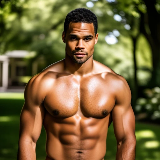 Very ((hot)) (handsome) mulatto man. The man has blue eyes like (Michael Ealy) a face and body build like (Shemar Moore) has styled facial Hair like (Boris Kodjoe) and Skintone like (LL Cool J). The background is a sprawling lawn with a (mansion). Over the horizon, a bustling city is just visible.