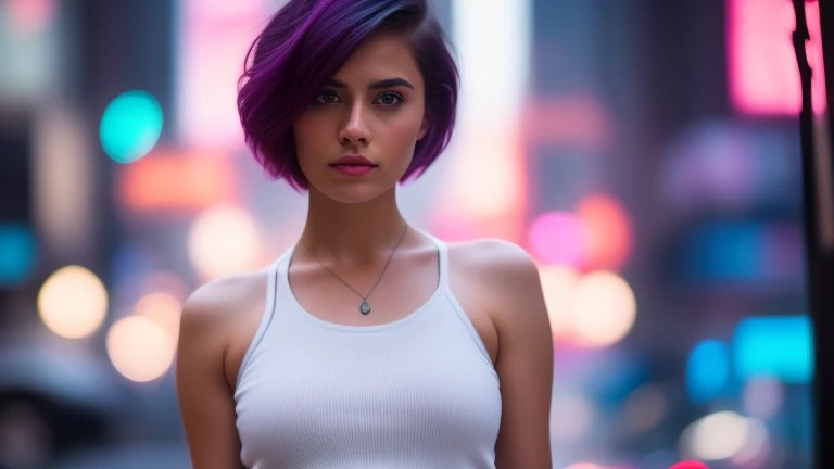 girl pixie cut hair, white knotted top, busty, d-cup, black denim shorts