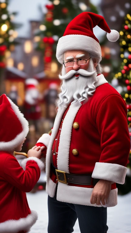Santa Claus, sometimes referred to as Father Christmas, brings joy to children at Christmas time. Displayed with a beard and red festive hat. in 3d, ((realistic)), ((action poses)), ((detailed background)), ((detailed bodies)), ((detailed faces)), ((detailed hands)), ((highest resolution)), ((highest quality)), ((clothed))