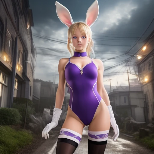 highest resolution, highest quality, 64k, sharp focus, ultra detailed, Mirkomha, boku No hero academia, standing, leotard, hero costume, white gloves, purple thigh highs, looking at viewer, rabbit ears, red eyes, realistic face, detailed face, smirk, athletic body, muscular, action pose,
