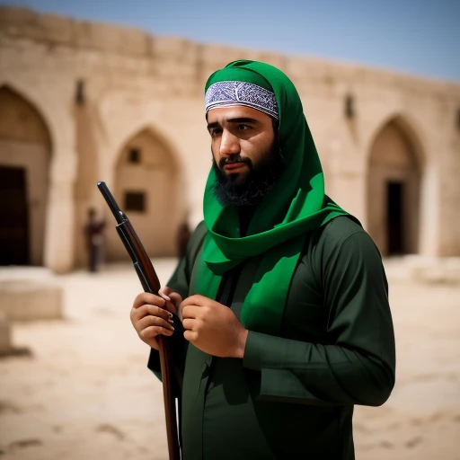 Hamas fighter wearing balacava, with green headband, the headband has writing in it:"La Ilaha Illallah Muhammad Rasul Allah", he is holding weapon in front of Al Aqsa Mosque