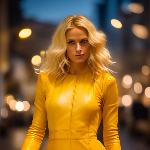 ((Poppy Delevingne))(long yellow leather dress:1.6)(((Photorealistic))),(showing full body) (((ultra detailed))) (nighttime), 8k uhd (muscular arms:1.2) (hips:1.5)(thighs:1.5)(breasts:1.7)((High Cheekbones)), ((Detailed Hands)), ((Feminine Hands)), ((Detailed Body)), ((Action Poses))