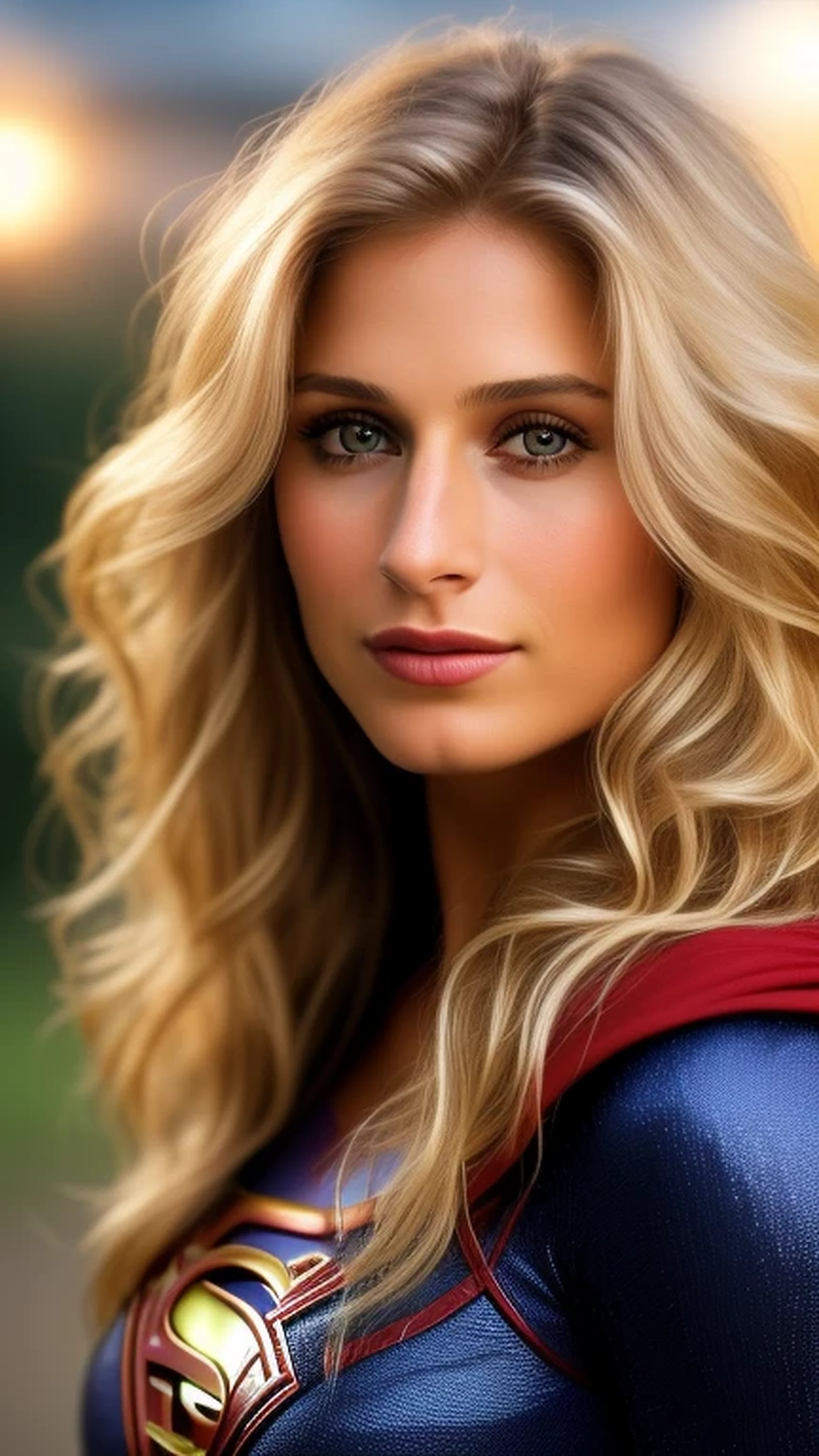 A very detailed and photorealistic picture of woman who looks like a cross between actress ((Helen Slater)) and ((Cher)). ((Her blonde hair has been styled to look the same way it did in the 1984 film Supergirl.)) She is wearing a pale blue dress and smiling. Fine detail is visible in her hairline and the fine and barely visible smile lines on her face. The depth of field is f9, so every aspect of her face and hair is in very fine detail. She is wearing dark eyeliner, and her face has a healthy glow that is very appealing. This is a stunningly good picture of her.