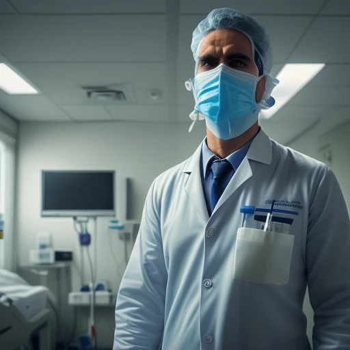 menacing look doctor with syringe wearing chirurgical mask in hospital,