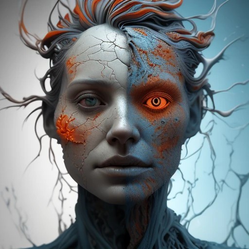 a close up of a person's face on a cracked surface, inspired by Alberto Seveso, featured on zbrush central, orange fire/blue ice duality!, portrait of an android, fractal human silhouette, red realistic 3 d render, blue and orange, subject made of cracked clay, woman, made of lava