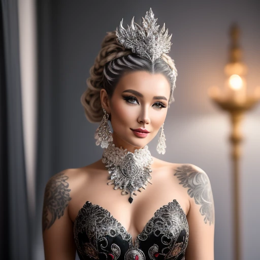 une femme avec un masque de dragon en or sur le visage, des écailles de dragon dans les cheveux, style Dan Hillier, avec une tête de dragon complexe et élégante, une tête de dragon femelle bien conçue, des écailles de dragon sur la racine des cheveux, style d'encre, avec un tatouage de tentacule, des cheveux incroyablement beaux style, dessins de cheveux uniques, contre-dépouille, coupe de cheveux en contre-dépouille, cheveux courts sur les côtés de la tête, bijoux très stylés en or
