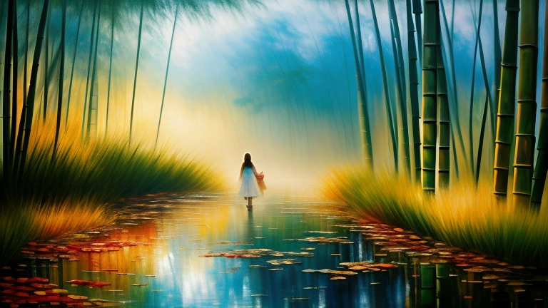colorwater, negative space, woman, lips, (trees:0.5), (flowers:0.6) ,(birds:0.2), (bamboo0.1), lakes, Hangzhou,