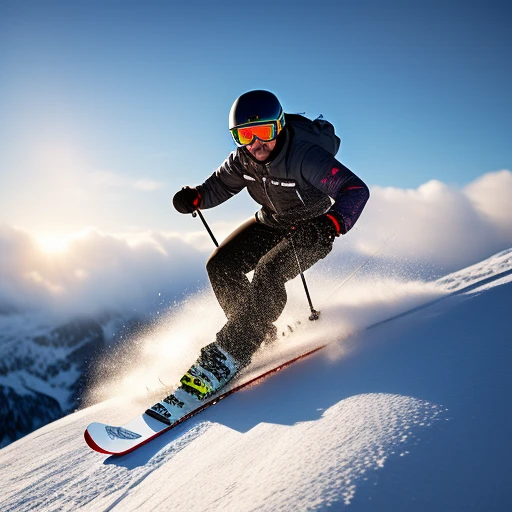 A person downhill-skiiing below a cloudy and snowy sky background ((3d)), ((realistic)), ((action poses)), ((detailed background)), ((detailed bodies)), ((detailed faces)), ((detailed hands)), ((highest resolution)), ((highest quality)), ((clothed))