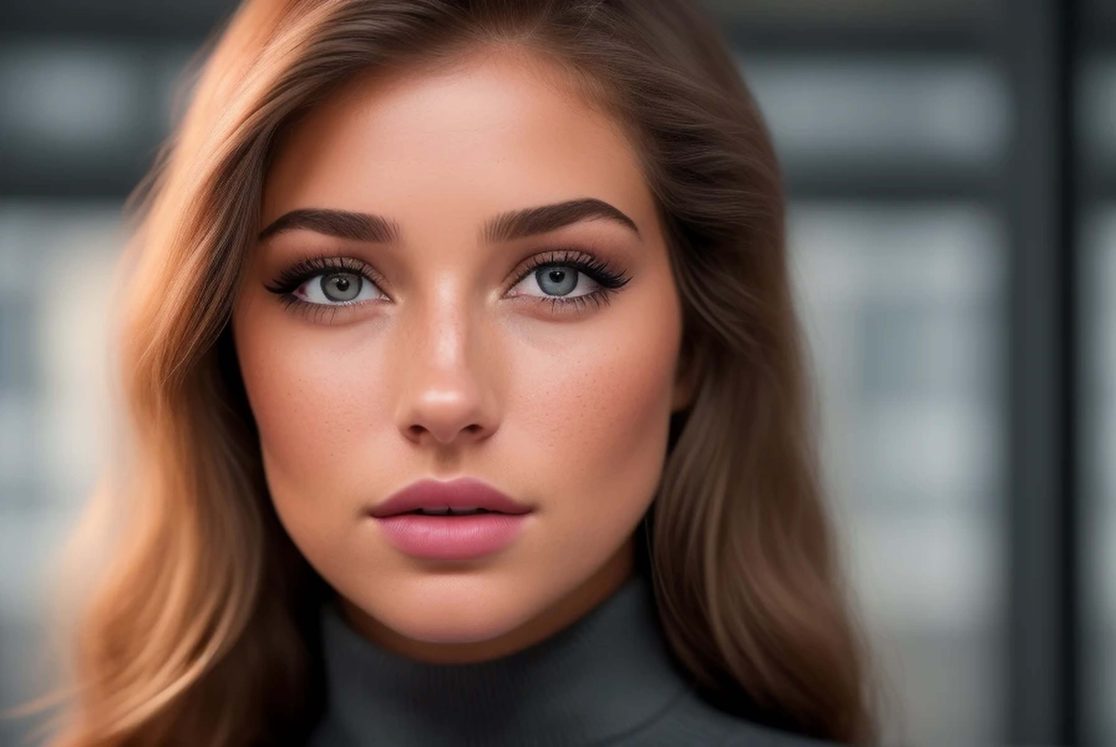 ((((8K UHD Associated Press super-tight close-up of JUST the eyes and nose of a young woman's face -- the eyes fill the width of the frame)))). Studio lighting. ((Perfect matching eyes, large round centered pupils with clear edges, irises have complex coloration, eyelids overlap edges of irises)). She has (straight, shiny, shoulder-length hair that is dark honey-blonde and shiny 1.9). ((Perfectly formed, realistic pale blue-gray eyes: round irises with complex radial striations; flecks of darker gray; round pupils one-half the diameter of the irises; realistic and detailed rectangular reflections in BOTH eyes)). (Long, dark lashes, black eyeliner and shiny blue-gray metallic eye shadow 1.9). (Some concealer, and dark pink blush on the crest of her cheeks 1.8). The woman is in her early to mid-20s, dressed in a (dark gray sleeveless turtleneck sweater). ((Her skin has visible small moles, but most of the imperfections that keep her skin from being totally smooth have been dealt with via makeup. Skin texture is extremely detailed, with pores, skin texture and makeup powder evident in picture 1.9.)) Facially, she resembles a cross between (Ellana Bryan 1.7), (Helen Slater 1.6), (Melanie Laurent 1.8), (Jadiann Thompson 1.7), (Elizabeth Turner circa 2020 1.2) and (Natalia Dyer 1.3). (Upper lip is a little less full than lower lip. 1.7) She also has (((visible puffiness under her eyes, a bluish cast to those bags, and deep lines separating that puffiness from her cheeks))), plus ((moderately full lips -- not thin, but definitely not puffy)), and ((a light sprinkling of very light, indistinct freckles across her cheeks, nose and chin with the concentration heaviest on her nose 1.8)), and ((a slight overbite that exposes the bottom half of her upper front teeth a bit more 1.5)). She has long, fine eyelashes. (Her lips show fine vertical lines, and are done up with glossy dark burgundy lipstick, almost like fresh blood, which enhances the "Goth" look 1.7).