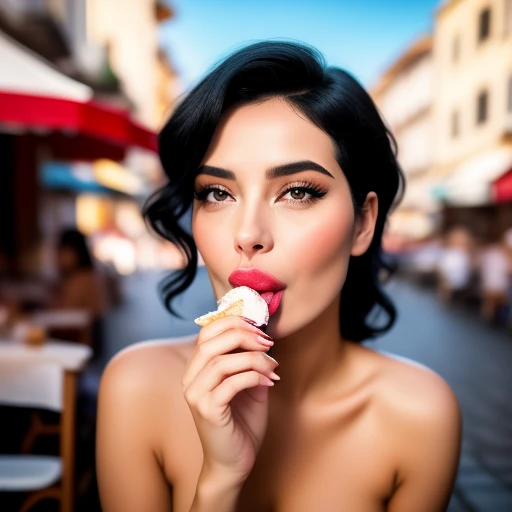 depicts a woman with black hair and full lips topless sucking an ice cream on the piaggia of naples