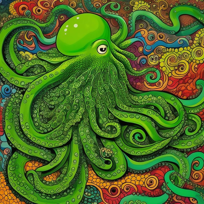 A green octopus plays a piano.