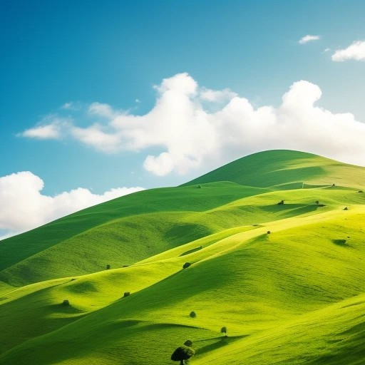 Two green trees grow on top of a hill, with blue sky and pure white clouds as background.