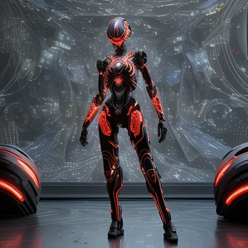 at night,huge and complex technical background,(masterpiece),(detailed),(intricate details),(realistic, photo-realistic:1.37),illustration,an extremely delicate and beautiful,8k wallpaper,absurdres,incredibly absurdres,ultra-detailed,highres,extremely detailed,beautiful detailed girl,extremely detailed eyes and face,beautiful detailed eyes,1girl,solo,(full body:1.3),blue fire,gear,giant robot,machine,damage armor,glove,machinery suit,(machinery boots),Mecha,science fit,updo,wearing mechanical equipment,nice ,Standing posture of model,Twist your body slightly,(Tall and elegant,slender figure:1.4),,(behind the luminous disc:1.2),,(The background is a star map:1.5), ,,Dance posture,Sexy posture,Tall and elegant,,Metal Takazawa,Gorgeous,Science Filament,(Red and black color case:1.3),