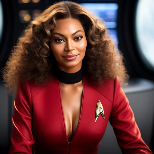 A very detailed and photorealistic picture of woman who looks like a cross between actress ((Nichelle Nichol)) and ((Beyonce)). ((Her black hair has been styled to look the same way it did in the original Star Trek series.)) She is wearing a Red Starfleet mini skirt uniform and back knee high boots and is smiling. Fine detail is visible in her hairline and the fine and barely visible smile lines on her face. The depth of field is f9, so every aspect of her face and hair is in very fine detail. She is wearing dark eyeliner, and her face has a healthy glow that is very appealing. This is a stunningly good picture of her.