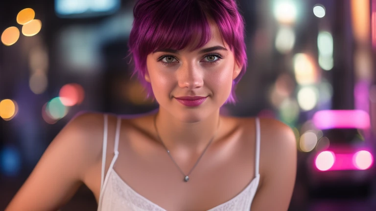 smiling girl pixie cut hair, white knotted top, busty, d-cup, black denim shorts, sea beach background