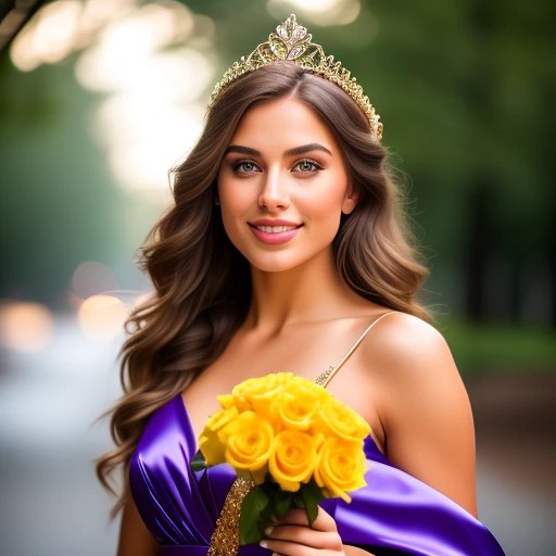 Miss NEW YEAR 2024 pageant winner, attractive young woman in her 20's, with a beautiful ((enchanting smile)), eveningwear style, wearing a ((single purple sash)), and ((diamond encrusted tiara style gold crown)), holding bouquet of yellow roses, midshot portrait, natural light, dark skin, natural look, hazel eyes, light brown hair, upper torso portrait, blurred background, natural light, photograph, detailed -- taken using a Canon EOS R camera with a 60mm f/4 lens, f/2.2 aperture, shutter speed 1/200s, ISO 300, Hyper Realistic Photography, Hyperdetail, Ultrahd, Color Correction, hdr, color grading, 8k --ar 4:5 --q 2
