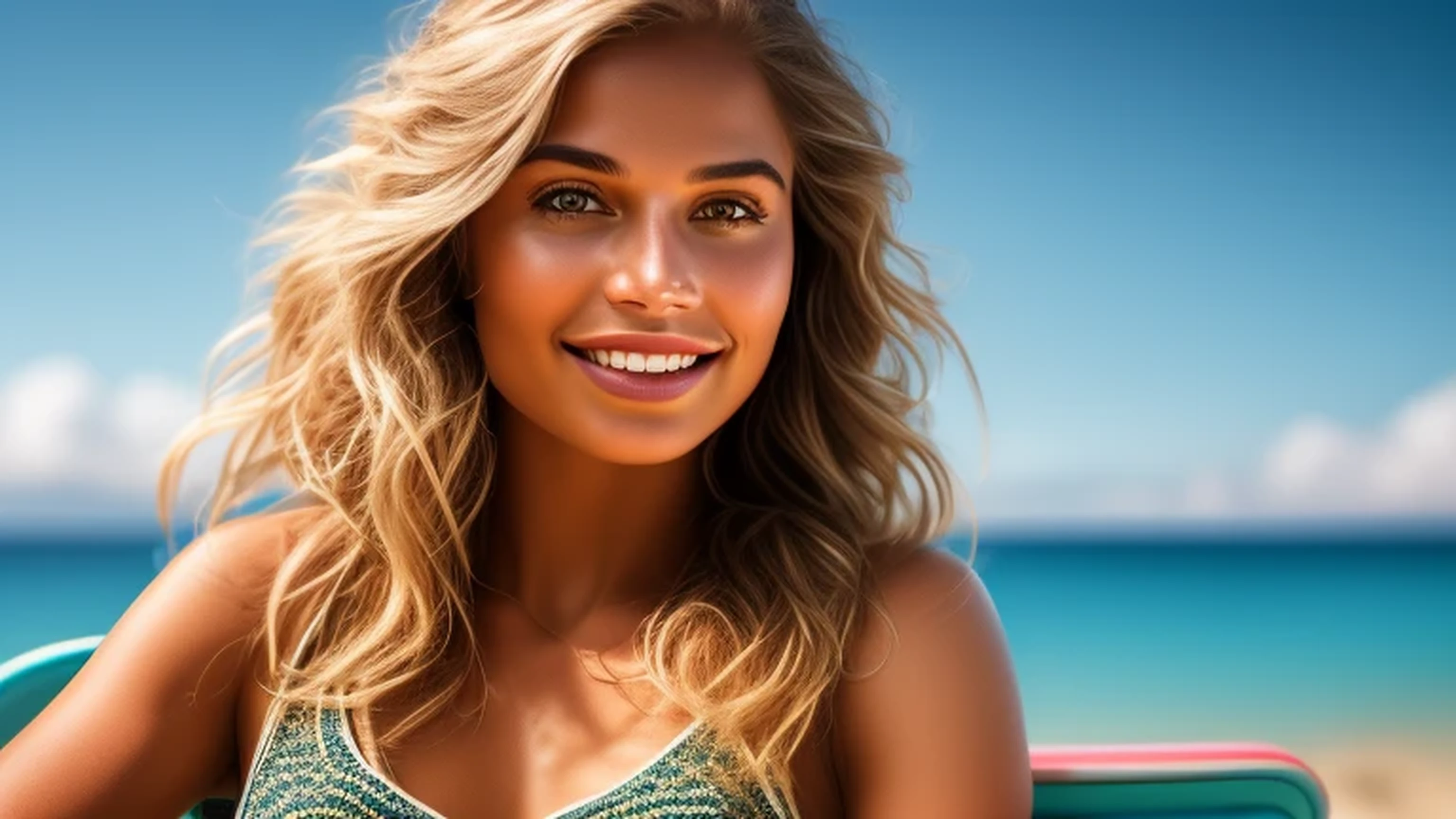3/4 view, Wear a Smile ((full size shot of [[[nude]]] girl on a beach chair)), [[[with scare on her cheek]]], ((3d)), ((ultra photo-realistic)), ((ultra-detailed)), ((perfect teeth)), ((action pose)), ((perfect hands)),