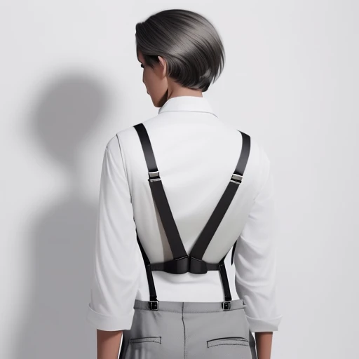best quality, (photorealistic:1.4), 1girl, (black shirt:1.2), (grey long pants:1.2),(white suspenders:1.4), perfect female figure, full body, from back, white background, short hair, slim
