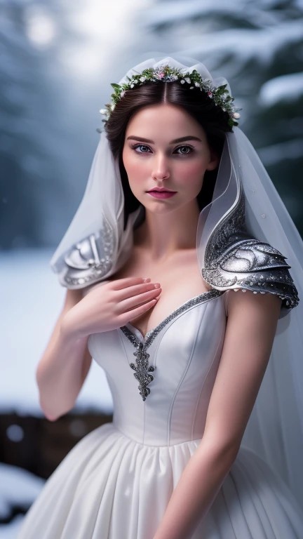 Snow White come to life. ((Photorealistic)), ((Detailed Face)), ((High Cheekbones)), ((Detailed Hands)), ((Feminine Hands)), ((Detailed Body)), ((Detailed Armor)), ((Action Poses)), ((8k)), ((uhd))