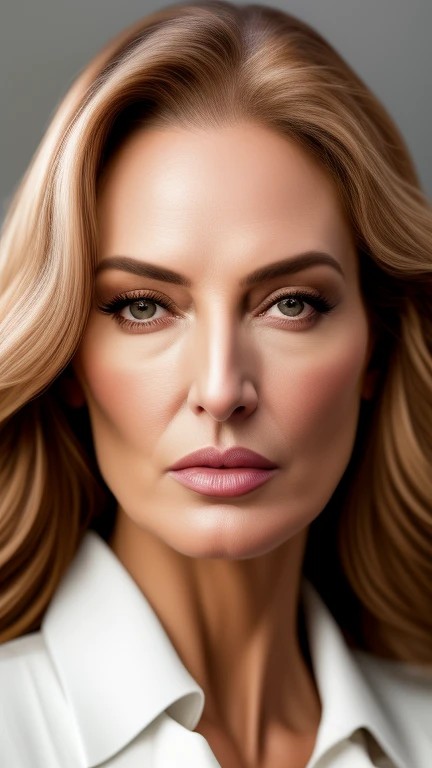 ((Associated Press high-resolution, extremely detailed portrait)), Facial mix of (Elizabeth Nottoli 1.9) (Jerry Hall 1,7) with JOAN SEVERANCE's eyes and nose, Woman in late 40s, with forehead lines, wrinkles, age spots around eyes, Sharp focus on face and hair, Wearing a white blouse, Includes eyebrows, surrounding skin, nose, mouth, teeth with high anatomical detail, Medical reference level detail: iris, color variations, capillaries in eye whites