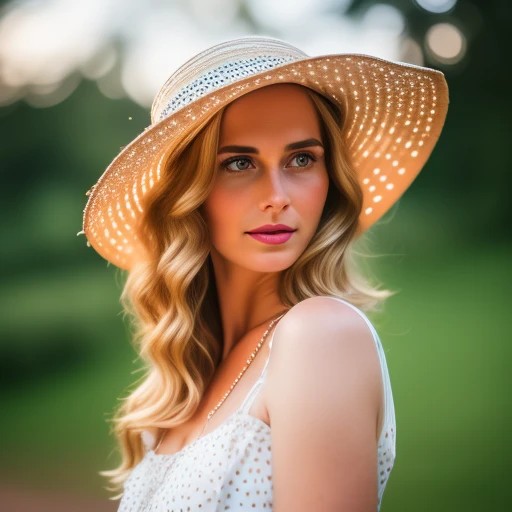mom wearing a white polka-dot dress and wide brimmed straw-hat riding a 1960's motor scooter ((Photorealistic)), ((Detailed Face)), ((High Cheekbones)), ((Detailed Hands)), ((Feminine Hands)), ((Action Poses)), ((8k)), ((uhd))