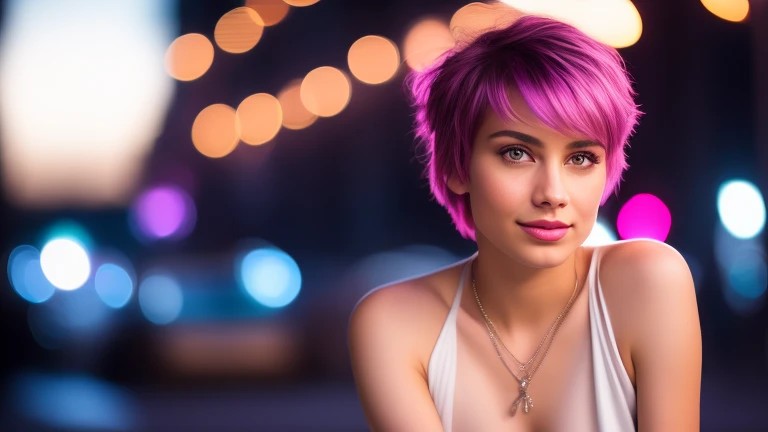 smiling girl pixie cut hair, white knott...
