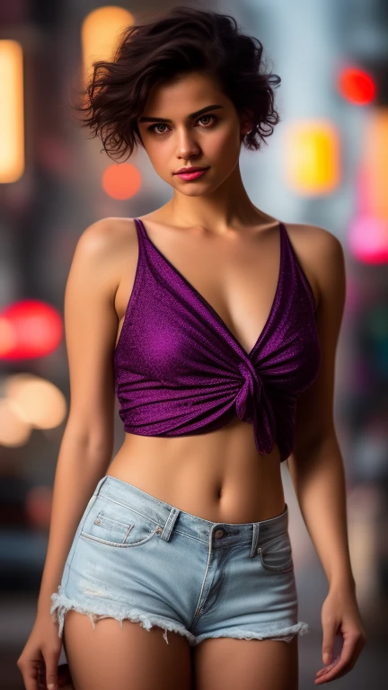 girl pixie cut hair, white knotted top, busty, d-cup, black denim shorts