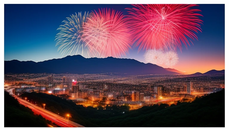 An postcard to celebrate a good 2024 With a big red text(Felice 2024). The background is a sky full of fireworks over the mountain. Photorealistic, sony alpha III, wide angle optic.