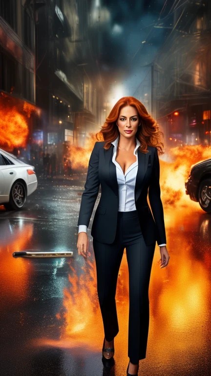 45 year old busty auburn haired woman ((news reporter)) holding a ((professional style TV news microphone)) wearing a business suit and pump heels with dramatic accident or fire background scene ((POV shot)), ((3d)), ((ultra-realistic)), ((ultra-detailed)), ((action poses)), ((detailed background)), ((detailed bodies)), ((detailed faces)), ((detailed hands)), ((surrealistic)), ((highest resolution)), ((highest quality)), ((clothed)), ((cleavage)), ((entire body)), ((from head to toe)), ((full body)),