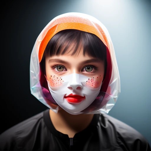 Close- up face mask. Multicolored eyes. Smooth Luminous orange clear film, Ike a sheet of paper. shining bright. on black background . Mixed Media Painting., product, photo, 3d render, painting Tags #Realistic