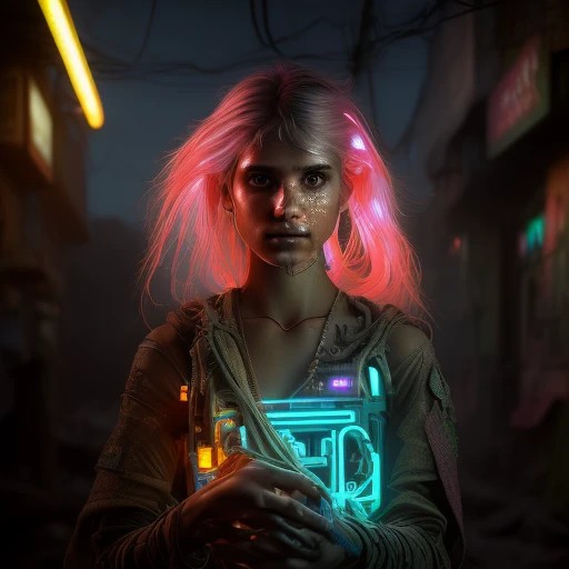android afghan girl photography by Steve McCurry in cyberpunk style,cyberpunk urban scenery,150mm,dlrs,robotic parts,beautiful neon soft light,bioluminescent tattoos,vibrant details,explicit soft mist,beautiful masterwork by head of prompt engineering