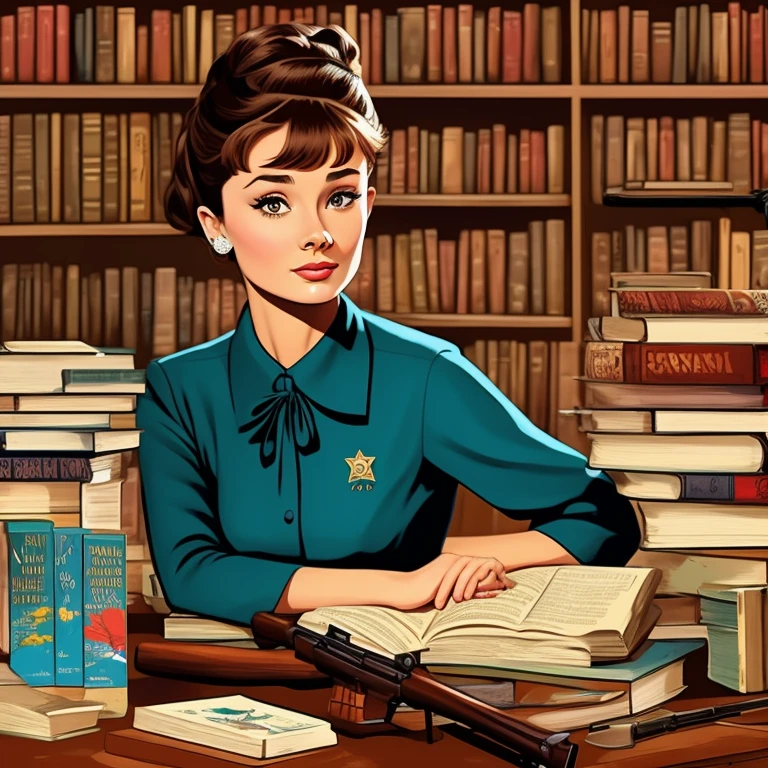 pretty librarian like Audrey Hepburn with rifle, books on background