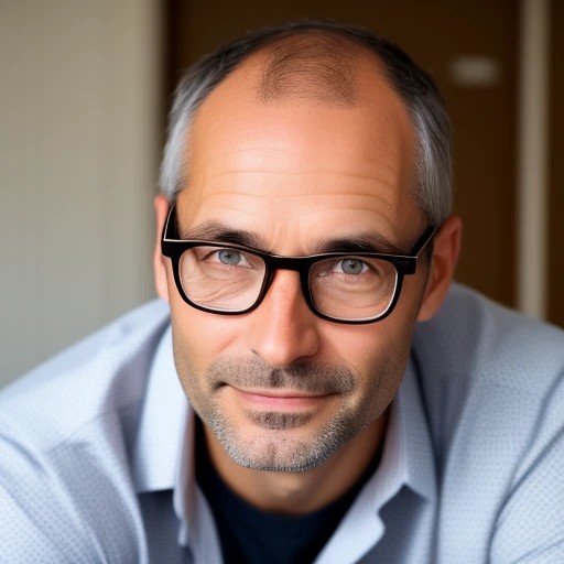 Male Teacher with glasses, 41 years old, braun eyes and thinning hair at top, a slight baldness is recognizable at the top